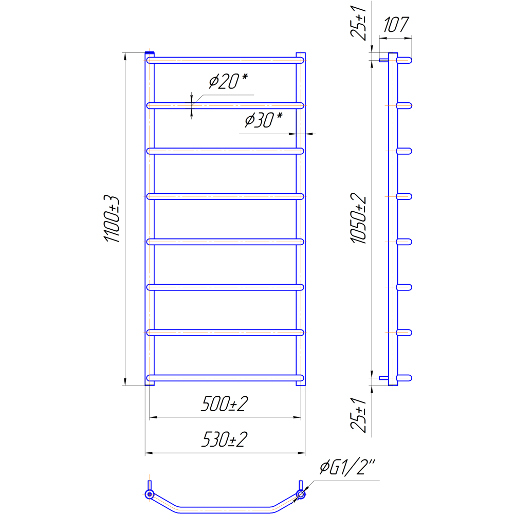 Рушникосушарка "Маріо" Трапеція HP 1100х530/500. Розміри: висота - 1100 мм, ширина - 530 мм, глибина 130 мм, міжцентрова відстань для підключення - 500 мм, діаметр підключення G1/2''. Приставка HP (Heat Point) - лінійка водяних та електричних рушникосушарок економ-сегменту. Єдиною відмінністю є менша кількість перемичок порівняно з виробами стандартного або преміум сегмента.Варіанти підключення: нижнє, діагональне та бічне. Кількість ребер - 8, стояки з круглої труби.Виготовлена з полірованої нержавіючої сталі без хромування. Варіанти покриття: полірована або сатин, чорний мат, білий глянець, золото, бронза. Для всесезонної роботи водяну модель можна переобладнати на комбіновану, встановивши ТЕН, рекомендована потужність 200 Вт.Сумісні аксесуари: поворотні полиці та навісні гачки для збільшення функціональності.Рекомендовано підключати рушникосушарку за допомогою кранів Маріо.Гарантія - 50 років в закритій системі опалення, 5 років у централізованій.