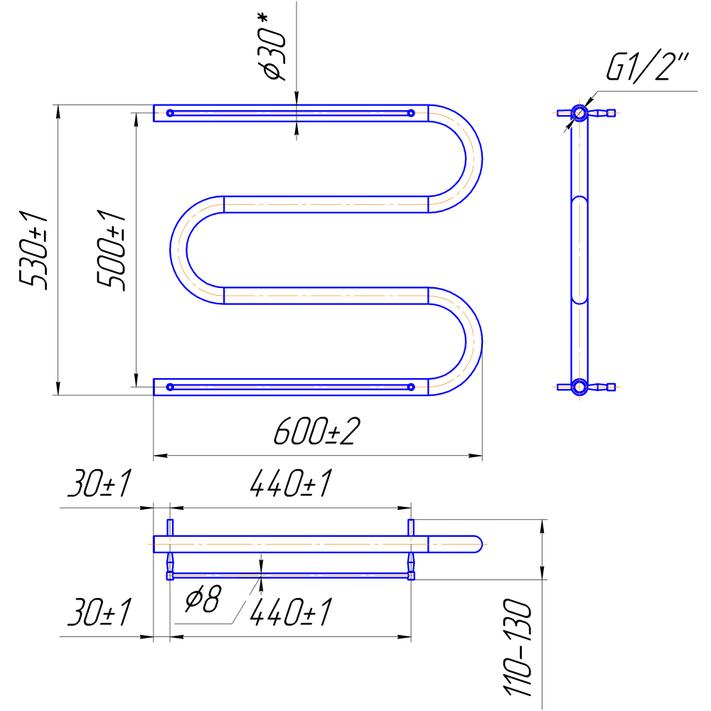 Водяна рушникосушарка Змійка ∅30 з полицею 530х600 з міжцентровою відстанню для підключення 500мм, діаметр підключення G 1/2'' 3 згини. Рушникосушарка Змійка 30 з полицею та боковим підключенням виготовляється на нашому підприємстві Маріо з 1998 року.