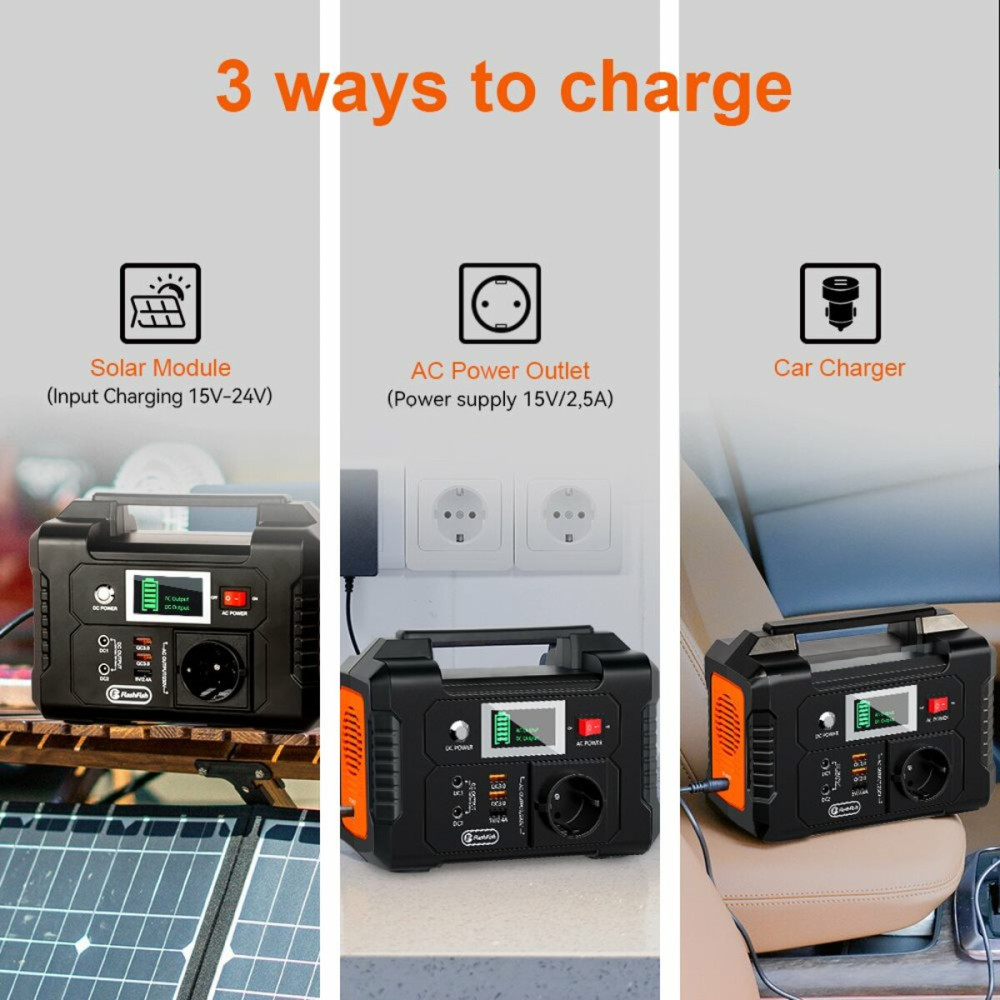 Щоб зарядити мобільну електростанцію Flashfish Е200, можливо використовувати 3 способи: