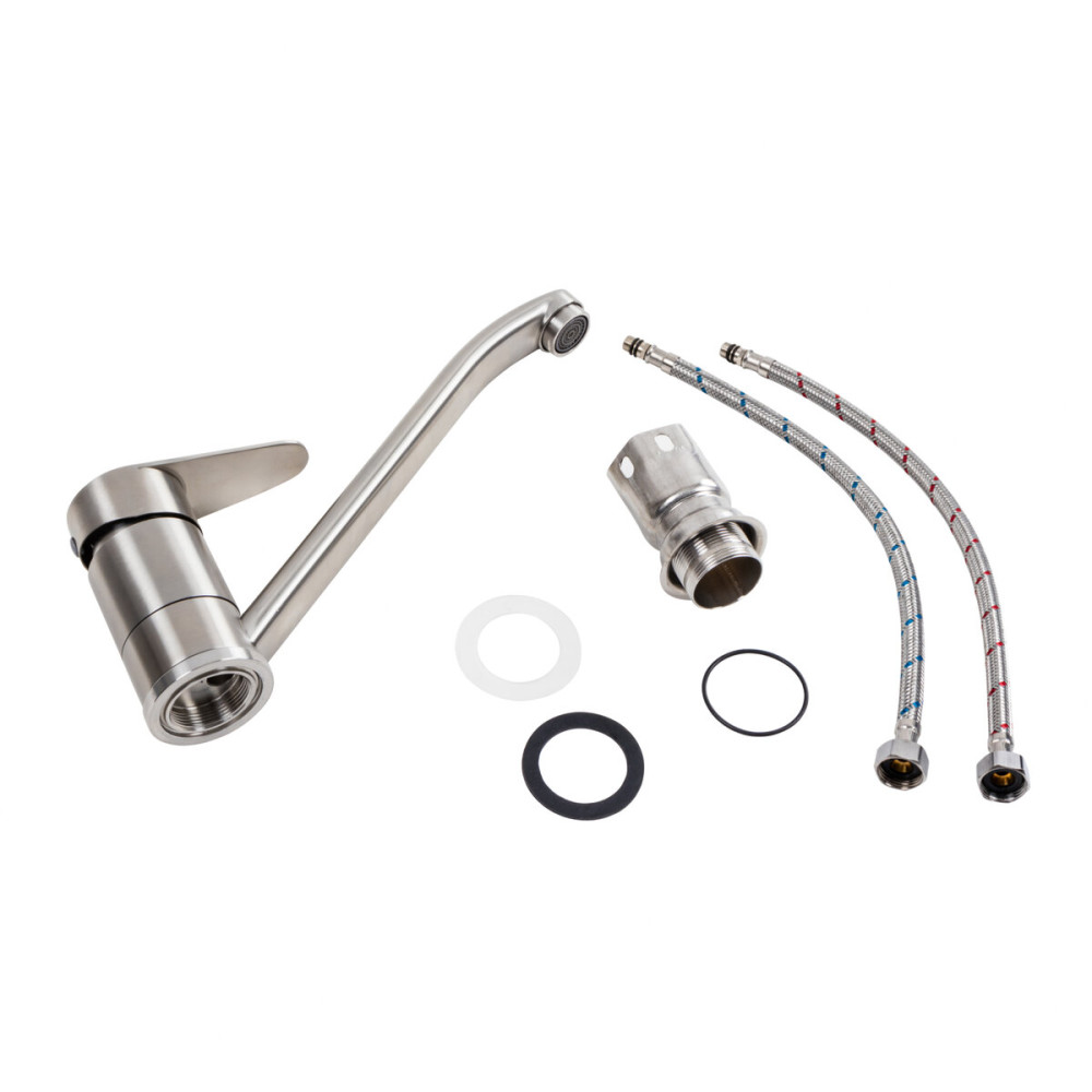 Довжина виливу - 90 мм, що робить його ідеальним для використання в різних розмірах мийок та кухонних просторів. Гнучка підводка та кріплення входять в комплект, забезпечуючи легкість встановлення.