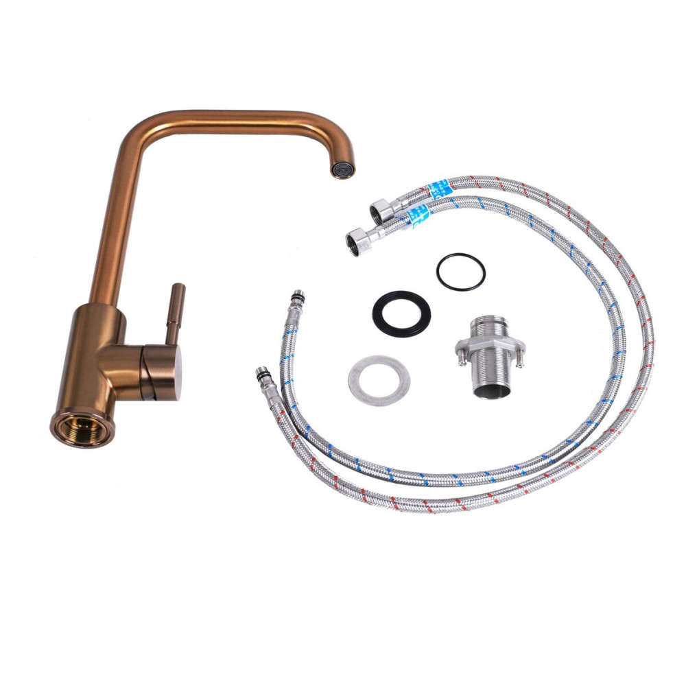 Кухонний змішувач Platinum PVD мідний 8004B-LI добре поєднується з гранітними та керамічними мийками. Він має поворотний вилив, що полегшує миття посуду та забезпечує зручне користування.