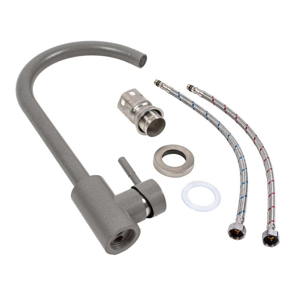 Змішувач кухонний Platinum 56 B NESP (3008 А)Сірий мусон відзначається сучасним та стильним дизайном. Він має колір Сірий мусон, який додає елегантності та оригінальності вашій кухні. Його висота складає 330 мм, що робить його ідеальним для використання з великими посудинами та каструлями. Довжина виливу становить 200 мм, що забезпечує зручність при наповненні горщиків та митті посуду. Змішувач виготовлений з високоякісної нержавіючої сталі SUS304, що гарантує його тривалий термін служби та стійкість до корозії.